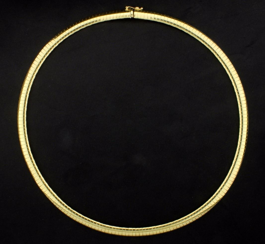 It is 14K yellow gold and is 18 inches long and 6mm wide. It has a safety clasp. 31.2g