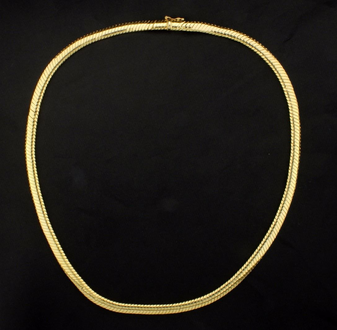 14K yellow gold, it is 5mm wide and has a safety clasp. 14.0g