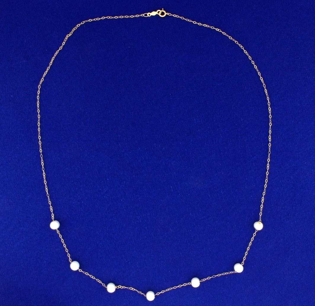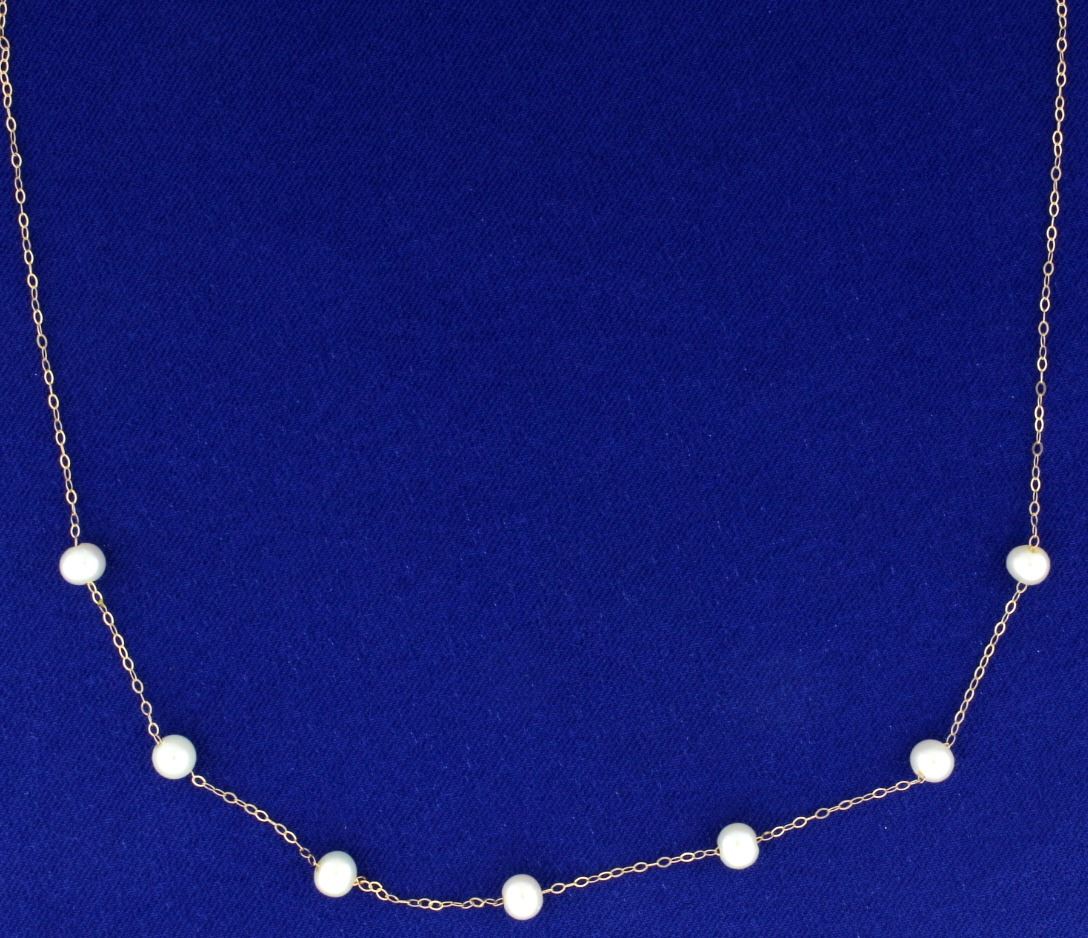 In 14k yellow gold. 18" long and 1.1mm thick. Contains seven 4.5mm pearls with great color and luster. 1.5g.
