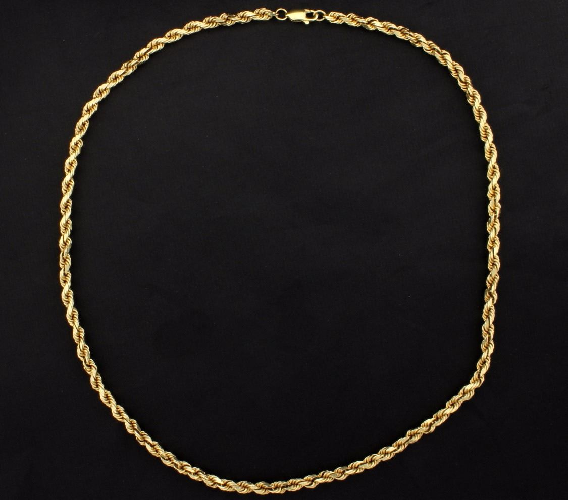The chain is 14K yellow gold and is 4mm thick with a lobster clasp. 22.3g