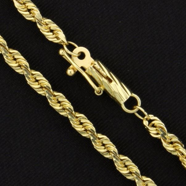 14K yellow gold, it is 2.5mm thick and has a lobster clasp.             11.8g