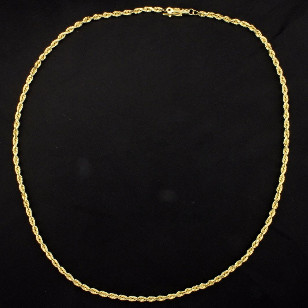14K yellow gold, it is 2.5mm thick and has a lobster clasp.             11.8g