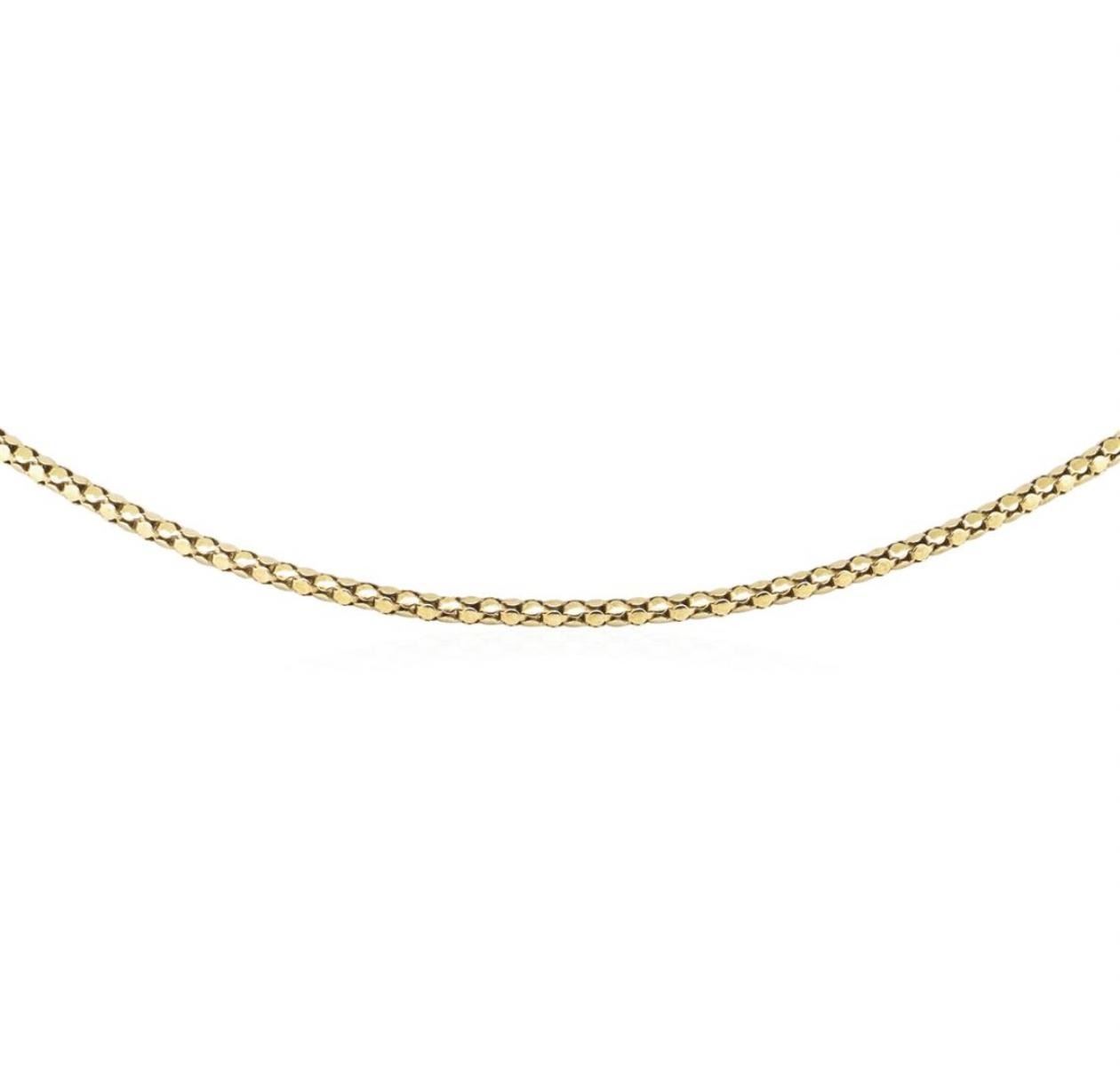One 2mm wide rounded popcorn link chain measuring 18 inches in length featuring: 14KT yellow gold weighing 5.5 grams.