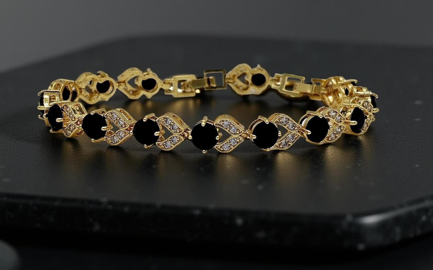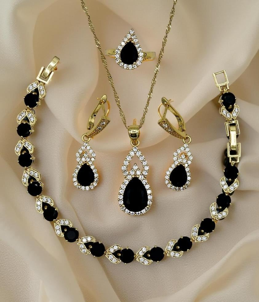 18 Kt Gold Plate 4 Piece Lab Simulated Black Diamond Jewelry Set. These Lab Faceted Gemstones Are Eye-Clean. They burst out with an flashing electric sparkle and a fine high polished mirror like hue. This complete 4 Piece Set Includes A 16 to 20 Inch Adjustable length necklace , a 7 to 8 Inch Adjustable Bracelet, 2 Earrings and an adjustable ring sz 6 to 9 to fit most sizes. All gemstones are mounted in 18 Kt yellow gold overlay . The Total Gram Wt Is Approximate Weight Of All 5 Pieces Is 31.2 Grams Or 156 Cttw. Don't buy just one piece of jewelry when you can have The Complete 4 Piece Set. Don't Miss This Springtime Package!!!