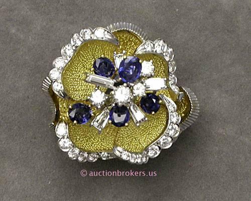 18 K YELLOW GOLD LADIES GEMSTONE AND DIAMOND RING IN A FLOWER DESIGN SET WITH ROUND BRILLIANT CUT AND BAGUETTE CUT DIAMONDS, 1 CT AND ROUND BRILLIANT CUT AND OVAL CUT BLUE SAPPHIRES, 1 CT. IN THE CENTER OF THE FLOWER. 22.8 GRAMS.