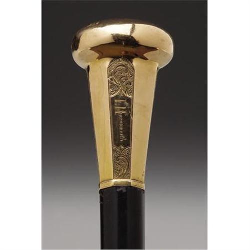 <B>18 KT. GOLD MOUNTED CANE OF BRIGADIER GENERAL ELON J. FARNSWORTH</B></I> - Killed at Gettysburg on the afternoon of July 3rd. Farnsworth was the only Union general killed behind Confederate lines in the Civil War. Elon John Farnsworth was born in 1837 in Green Oak, Michigan and his family relocated to Rockton, Illinois in 1854. in 1855 he enrolled in the University of Michigan where he was known as a bit of a dandy and renowned for his student hijinks. Finally, in his sophomore year he was expelled for his involvement, with a number of other students in a drinking escapade that resulted in the death of one of the students. His response was, in 1858, to join the US Army’s expedition to Utah as a civil forage master, where he remained until the outbreak of the Civil War. This cane doubtless has its point of origina during the University of Michigan/Utah years. At the outbreak of the Civil War he was initially commissioned a 1st Lt., quickly rising to the rank of Captain, in the 8th Illinois Cavalry which had been organized and was commanded by his namesake uncle John F. Farnsworth. By the spring of 1863 he was serving on the staff of Alfred Pleasonton. Farnsworth captured Pleasonton’s attention at Brandy Station, where, after all of his superior officer’s were killed or wounded he took command of the 8th Illinois. With the aid of Pleasonton and his namesake uncle, who was now a politically influential congressman, he was promoted to brigadier general on the same set of orders as Custer and Merrit and took command of a brigade under Kilpatrick. Farnsworth was characterized as “tall, slight, and pale” and as “courage incarnate but full of tender regard for his men”. His command ability and bravery were immediately evidence when he led the decisive charge that turned back Gen. J. E. B. Stuart’s cavalry on the streets of Hanover, Pa. on June 30, 1863. His bravado, while admired by all who witnesses him in combat would soon cost him his life. At Gettysburg, on the afternoon of the 3 July, after the repulse of Pickett’s charge, Kilpatrick ordered Farnsworth to lead a charge against Confederate infantry positions. Farnsworth recognized the futility of such an action and protested vigorously to Kilpatrick, who, in response, questioned Farnsworth’s honor and courage, stating he would lead the charge himself. Farnsworth vehemently protested that no one would lead his men into battle other than himself and, in a charge that many have likened to that of the Light Brigade was killed in volleys of gunfire from the 15th Alabama Infantry, his body being pierced by no less than eight bullets. In a touch of both irony and tragedy Farnsworth, upon his expulsion from the University of Michigan apologized to his professor of history stating that he “would yet show that he could make a man of himself.” The cane is 35 5/8” overall, with an ebony shaft, iron tip and 18 kt. Gold head with eight facets around the base. Two of the facets are exquisitely engraved with a scroll motif on a cross hatched background, another utilizes the same motif but includes a 1” panel which is beautifully engraved “E. I. Farnsworth” I and J being interchangeable with I generally used to represent both letters). The cane descended through the family and is completely untouched. A most attractive and rather touching artifact from one of the most gallant and heroic cavalry officer’s of the American Civil War.<BR><BR><B>Provenance: </B></I><I>The Don Tharpe Collection of American Military History.</B></I><BR><BR><b>Shipping:</b> Bats, Clubs, Sticks, Swords, Rif (<a target="_blank" href="http://www.heritageauctions.com/common/shipping.php">view shipping information</a>)
