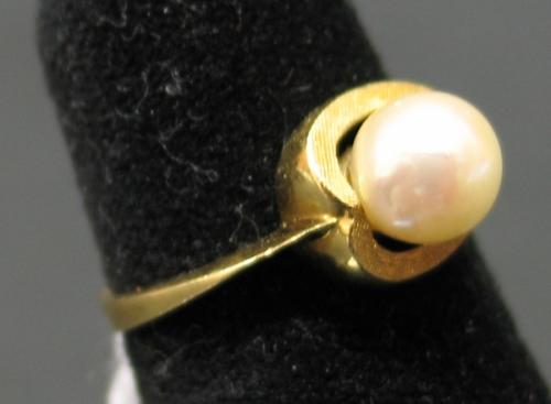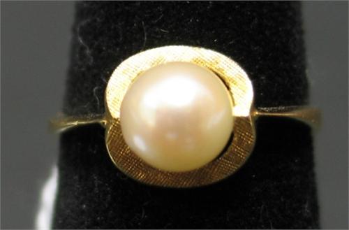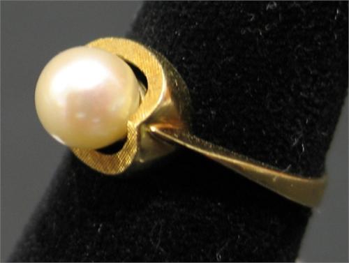 18 KT YELLOW GOLD RING. Contains 6.7 mm cultured pearl. 2.5 grams. Ring size 5 ¼. CAGA appraisal.