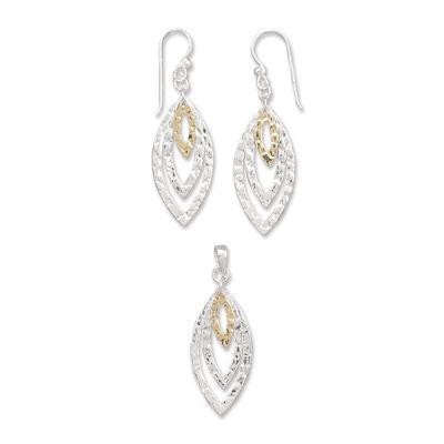 Polished hammered sterling silver and 18 karat gold plated sterling silver marquise drop french wire earrings and pendant set. Earrings measure 48.5mm x 15mm and the pendant is 41mm x 15mm. .925 Sterling Silver
