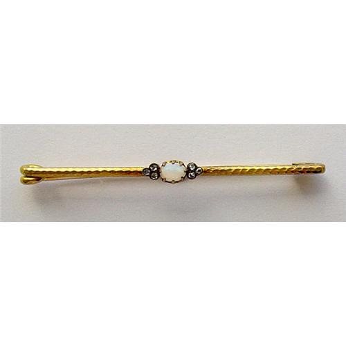The 18Kt gold safety pin is hand hammered and prong-set with a cabochon opal at center flanked by six small rose cut diamonds, three on each side. Gold is 18Kt (unmarked, but tested) with 22Kt gold finish, which was the style of the turn of the 19th to the 20th century.