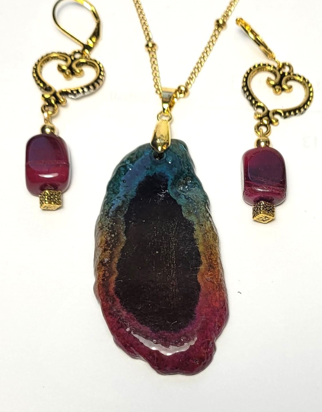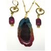 GEODE PENDANT ON GOLD TONE 18" CHAIN & COORDINATING GOLD TONE WITH HEARTS, RED TIGER'S EYE DROP EARRINGS ON LEVERBACK WIRES. JEWELERY