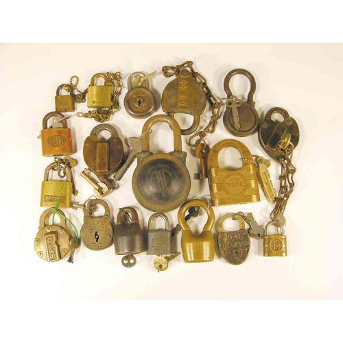 18 Misc. Padlocks including G.P. Company, S.P. Company, Fraim, Yale and two barrels. Various sizes and conditions, all with keys.