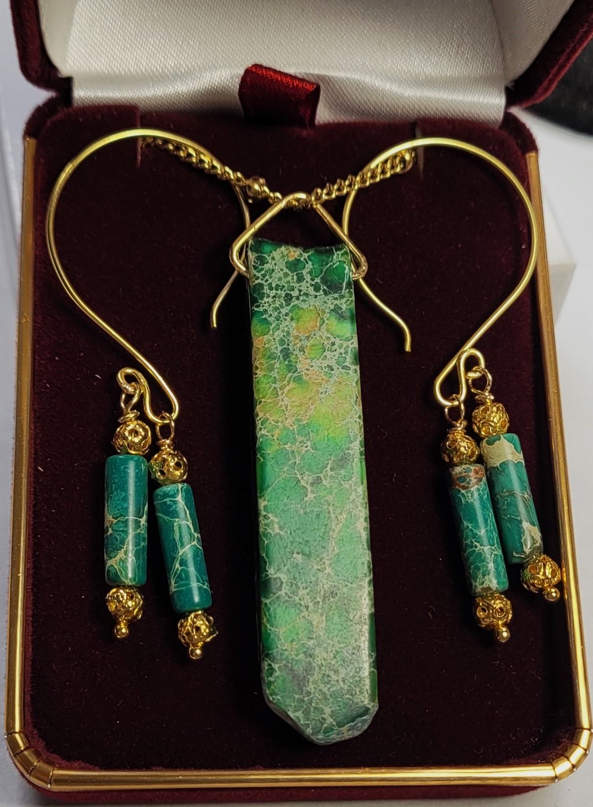 WITH GOLD TONE 18" CHAIN ON PENDANT & HOOP WIRES VELVET GIFT BOX INCLUDED. JEWELERY