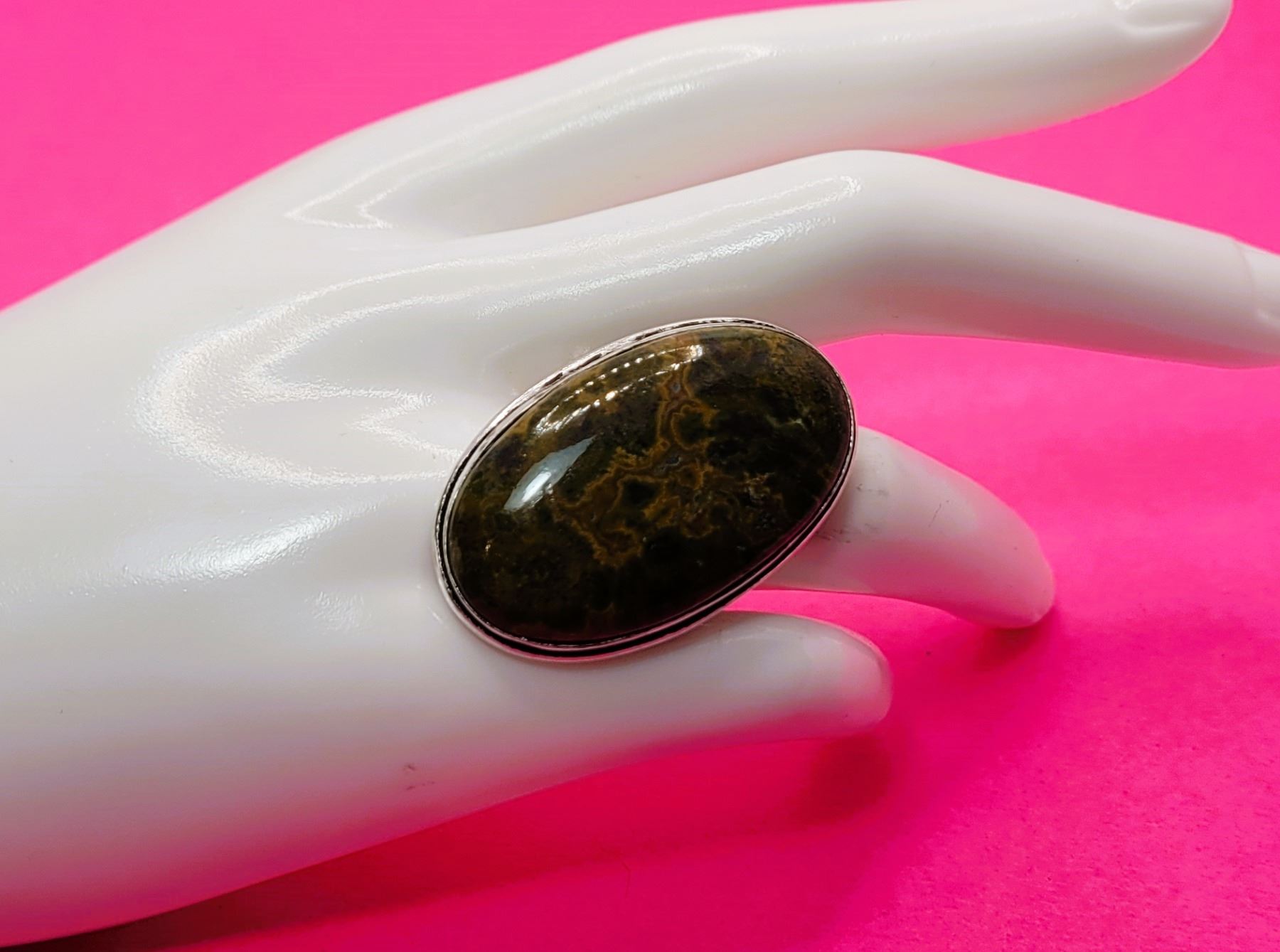 18) NATURAL OVAL JASPER STATEMENT RING, SIZE 9,