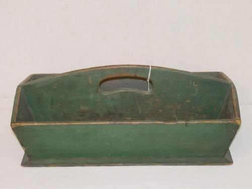 18" NEW ENGLAND 19TH CENT. PINE CUTLERY HANDLED TRAY W/ OLD GREEN PAINT - PAINT WEAR & IMPERFECTIONS;