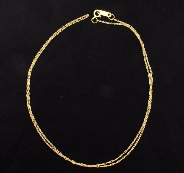 The 14K yellow gold chain is .7mm thick. 0.6g