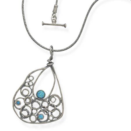 18 inch oxidized sterling silver toggle necklace with abstract pear and circle design pendant featuring synthetic opal. The synthetic opal measures 6mm, 3mm and 2mm. This necklace has a toggle closure. .925 Sterling Silver