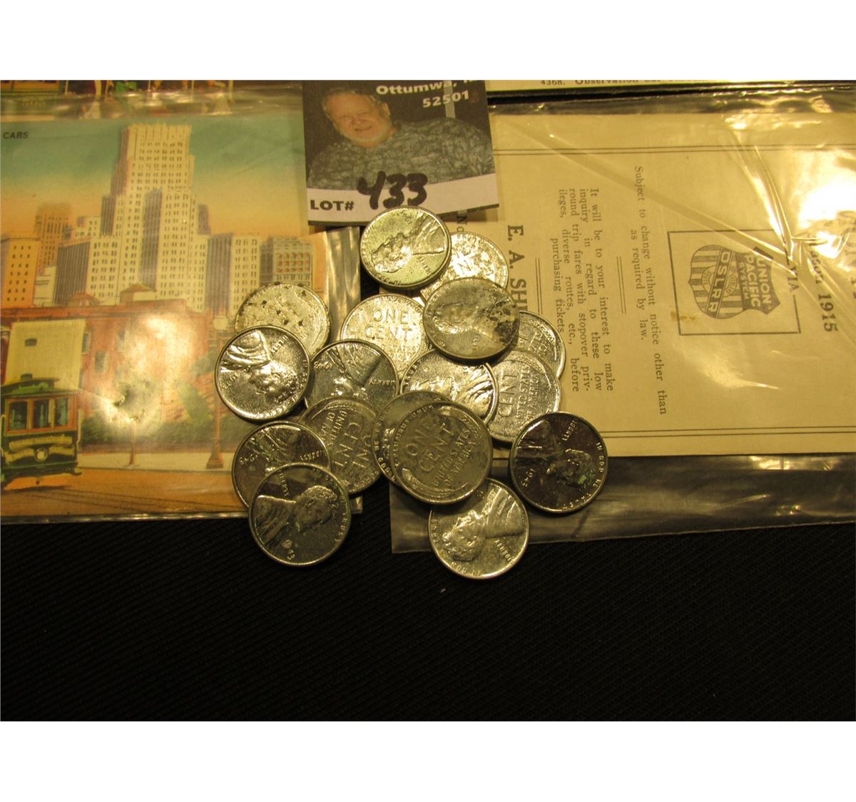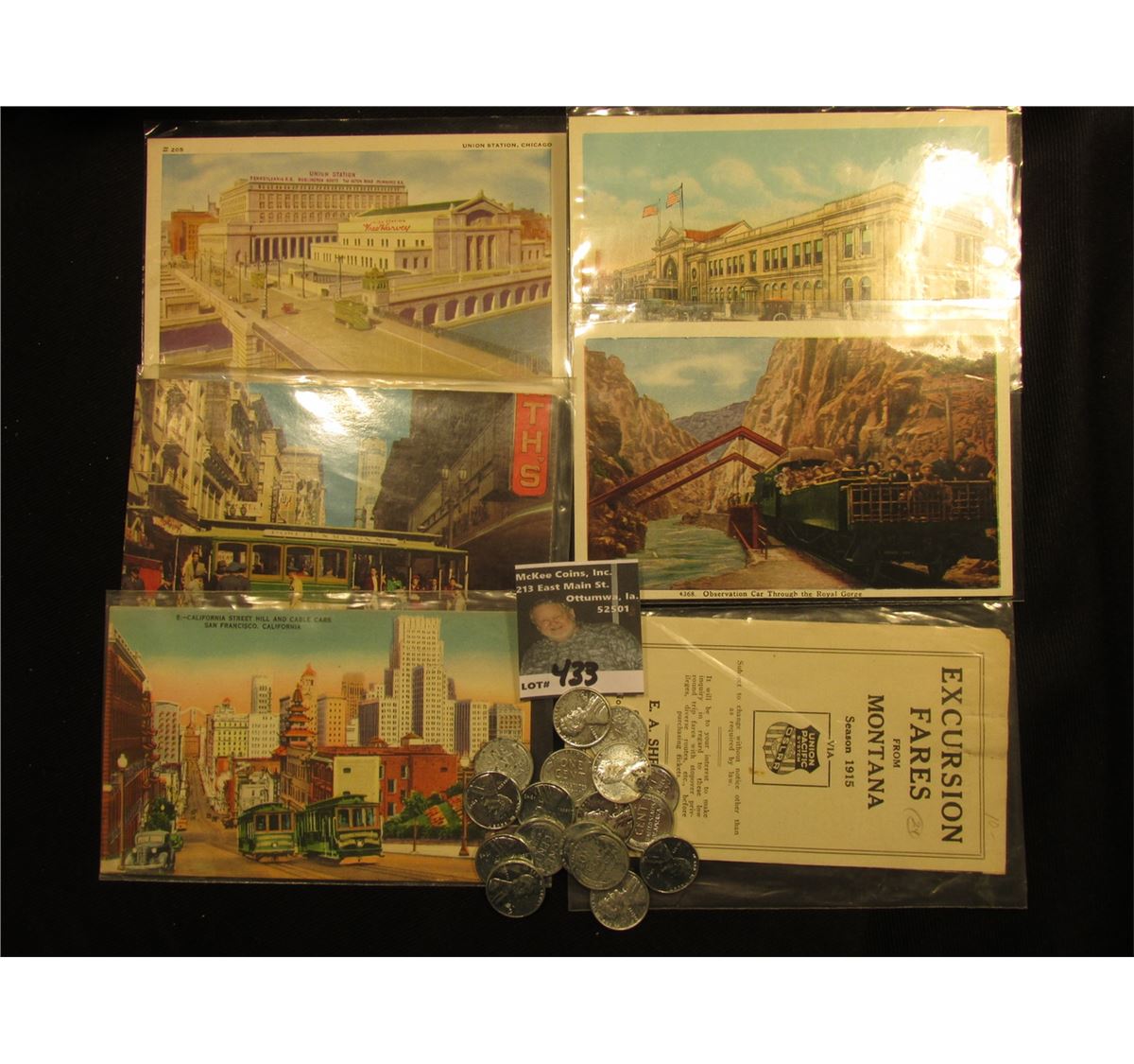 (18) Old World War II 1943 Steel Cents; 1915 Union Pacific General Agent Season Booklet "Excursion Fares from Montana"; & (5) Different Train or Trolley Post Cards.