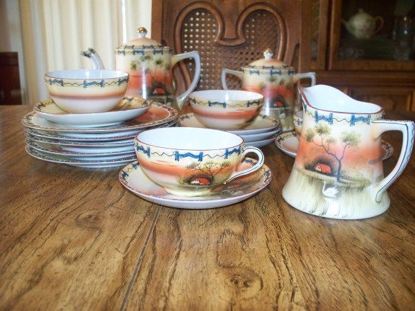 18 PC. NIPPON TEA SET, YELLOW W/SWANS ON LAKE