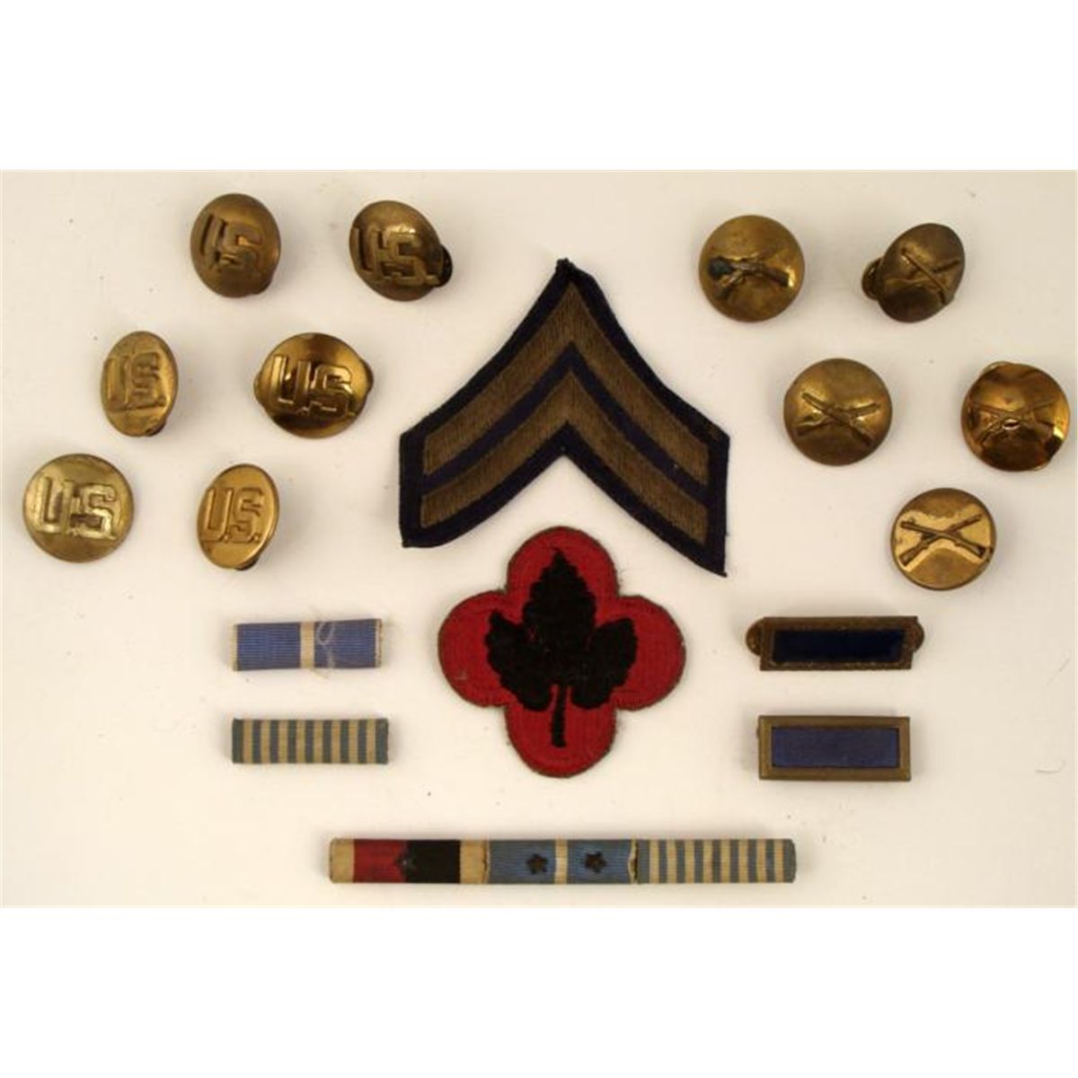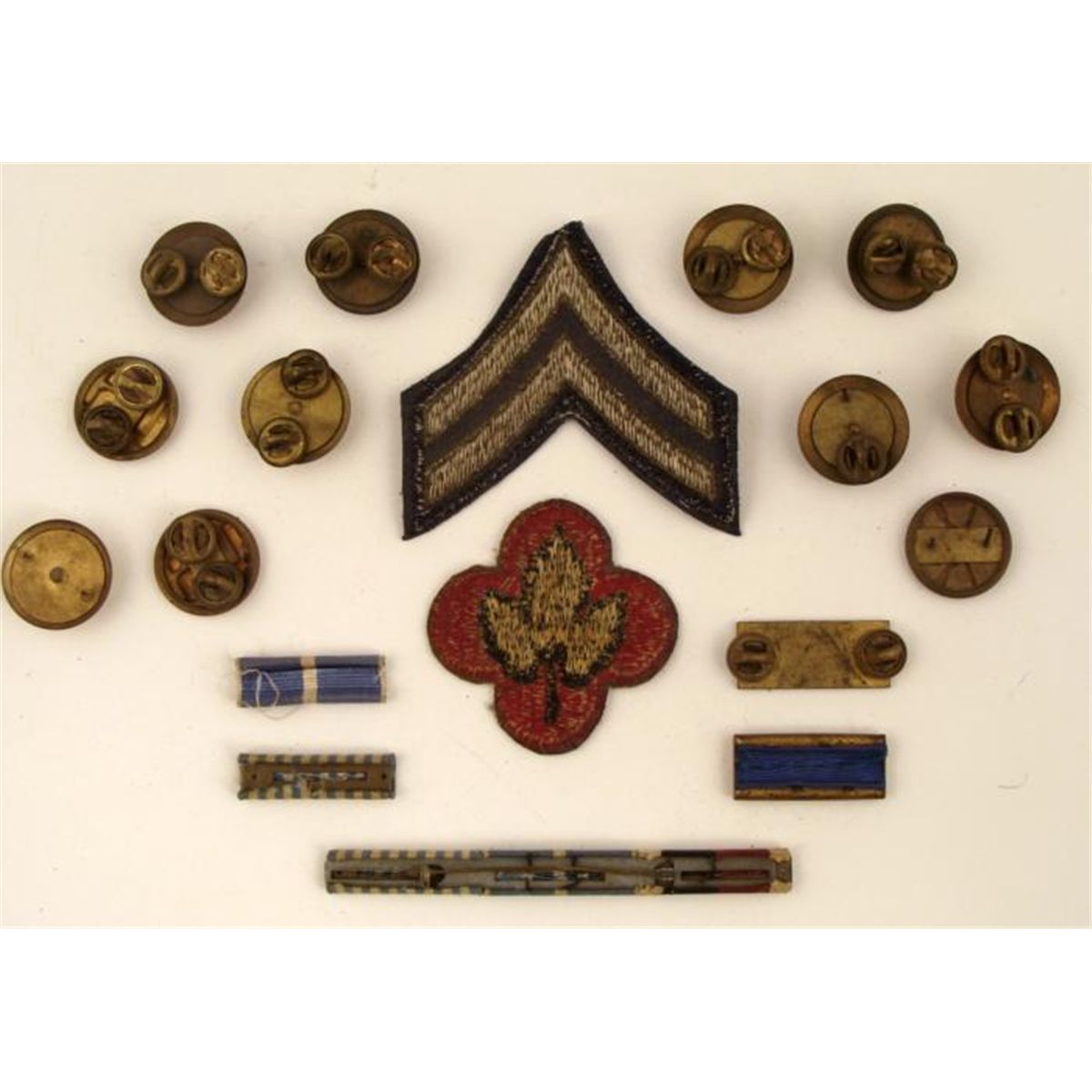 18 PC WWII COLLECTION-INCL 43RD DIV PATCH-COLLAR BRASS-DIST.UNIT BARS-RIBBON BARS * MOST BRASS HAVE CRIMPS IN THE BACK *