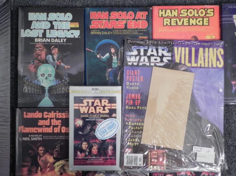 This is a lot of 18 Star Wars items, all in excellent to mint condition.They include: * Hardcover Books: * * Lando Calrissian and the Mindharp of Sharu * Lando Calrissian and the Flamewind of Oseon * Han Solo at Stars End * Han Solo's Revenge * Han Solo and the Lost Legacy * Dark Force Rising * The Last Command * * Paperback Books: * * Han Solo at Stars End * * Audio Books on cassette: * * Heir to the Empire * Dark Force Rising * The Last Command * * Magazines: * * Heroes, with posters * * Art Set: * * Paint by Number, from Craft House * This is a nice variety of reading with exciting adventures of the Star Trek universe.