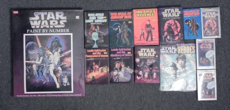 This is a lot of 18 Star Wars items, all in excellent to mint condition.They include: Hardcover Books: Lando Calrissian and the Mindharp of Sharu Lando Calrissian and the Flamewind of Oseon Han Solo at Stars End Han Solo's Revenge Han Solo and the Lost Legacy Dark Force Rising The Last Command Paperback Books: Han Solo at Stars End Audio Books on cassette: Heir to the Empire Dark Force Rising The Last Command Magazines: Heroes, with posters Art Set: Paint by Number, from Craft House This is a nice variety of reading with exciting adventures of the Star Trek universe.