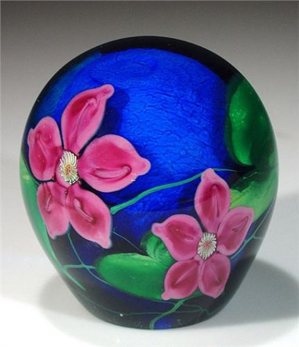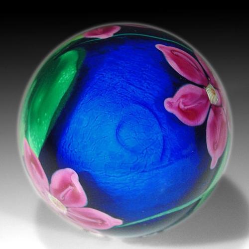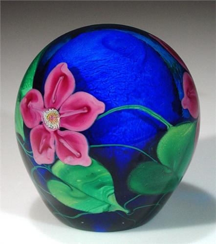 Peter Raos 1998 "Pink Paradise" high-domed paperweight, with pink blossoms and heart-shaped green leaves on vines, against a dark blue background. Signed/dated. Height 3 1/8", diameter 2 7/8". NO RESERVE
