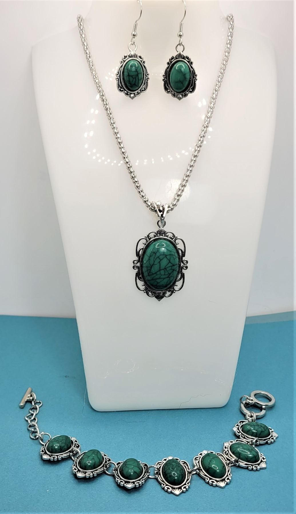 JEWELLERY, INCLUDES: PENDANT ON 18" CHAIN, 8" BRACELET AND DROP EARRINGS. JEWELLERY