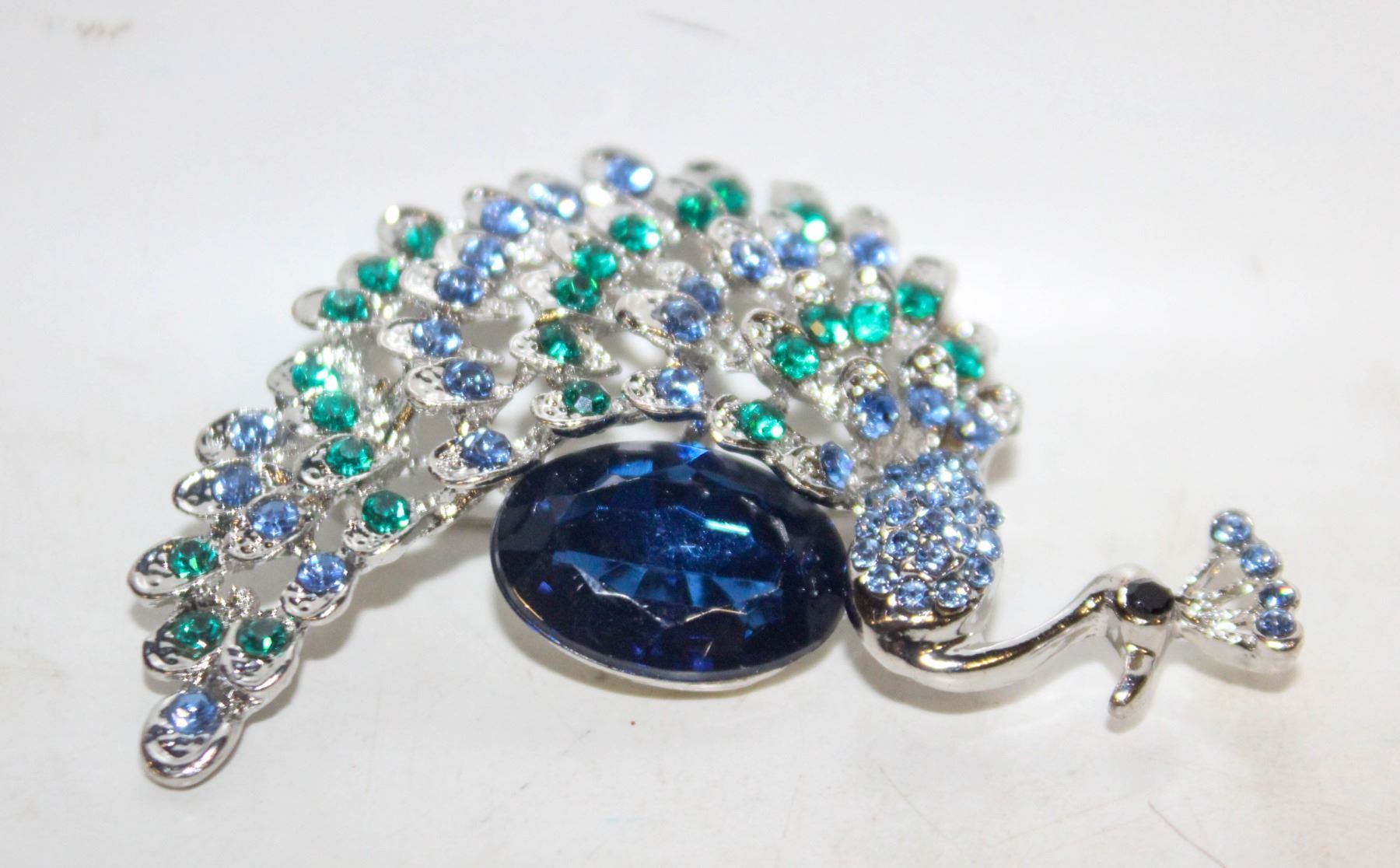 CRYSTALS PEACOCK BROOCH WITH LARGE SAPPHIRE BLUE CRYSTAL EGG. JEWELERY