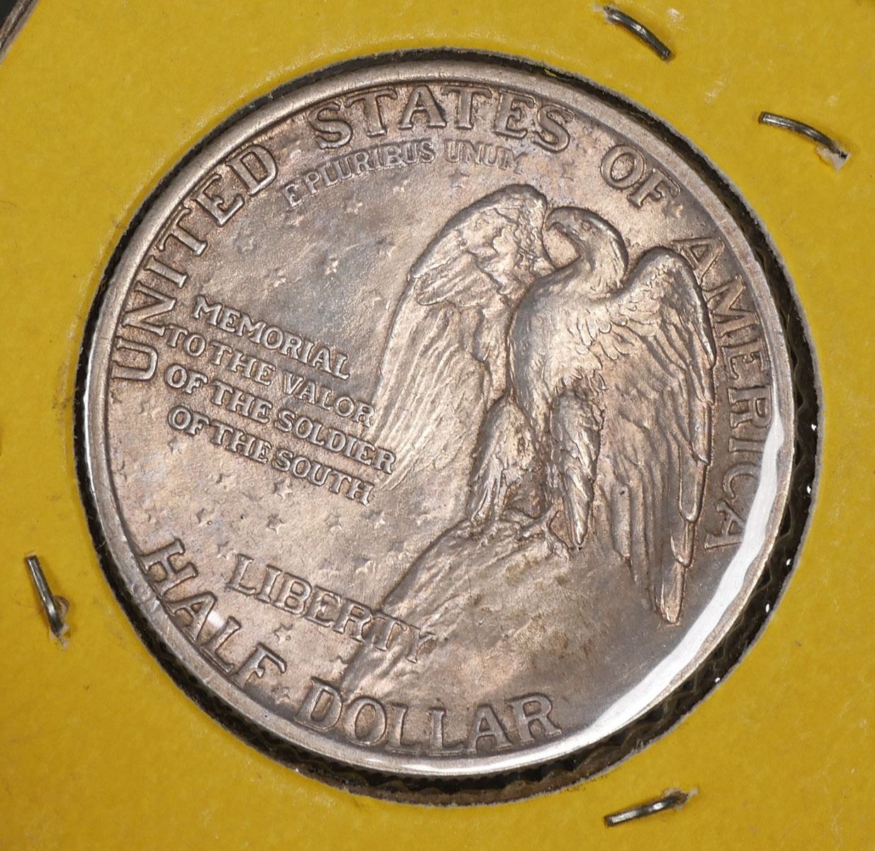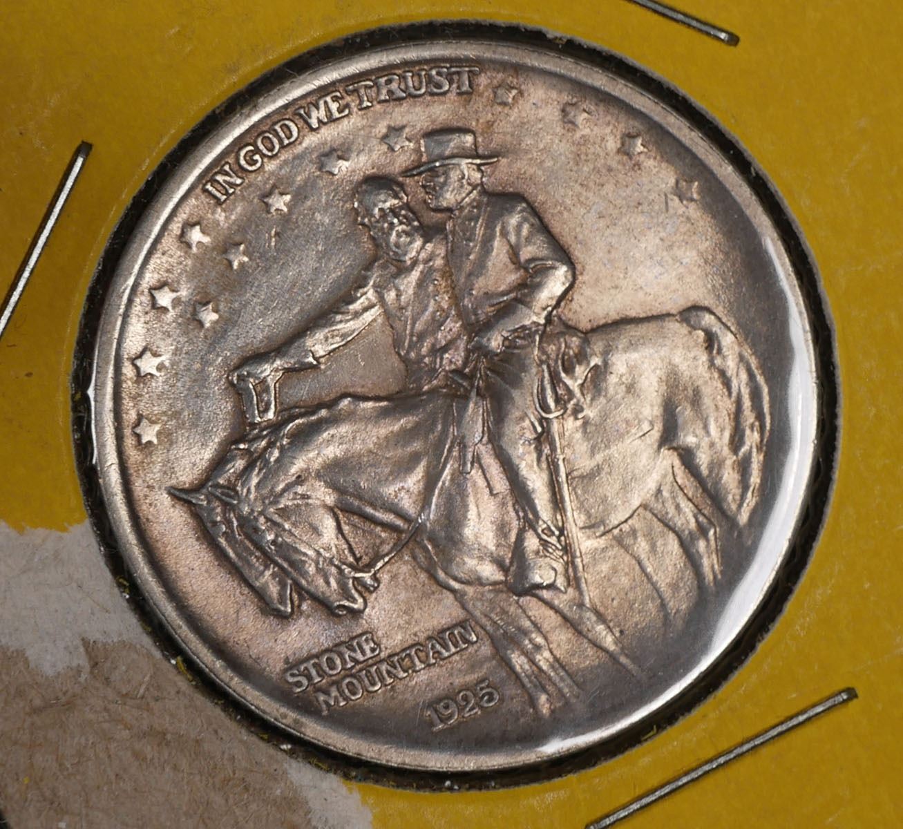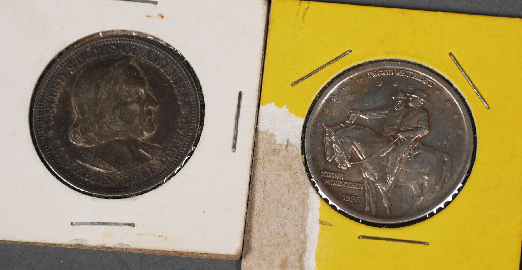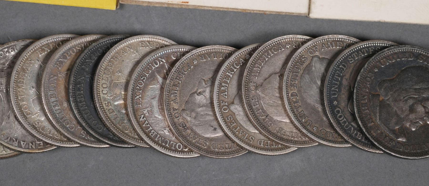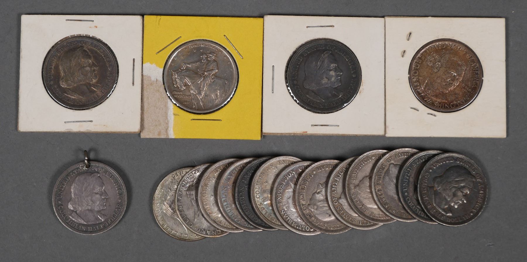 (14) 1893 Chicago Columbian Exposition half dollars. (2) 1920 Pilgrim Tercentenary Celebration half dollars, (1) 1925 Stone Mountain half dollar, (1) 1946 Booker T. Washington half dollar. All 50 cent pieces are circulated, one has a hole.