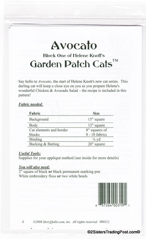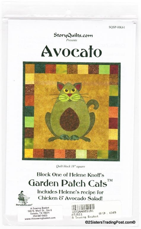 Pattern for 'Avocado' 18" quilt block #1 of Helene Knott's Garden Patch Cats for Story Quilts.com. Each quilt pattern includes a special corresponding recipe 'Chicken & Avocado Salad'