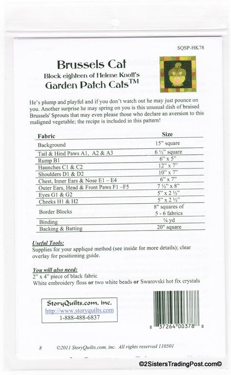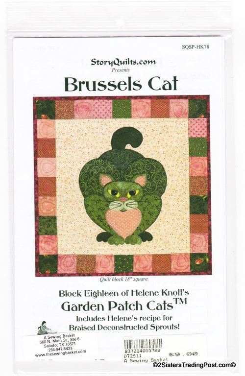Pattern for 'Brussels Cat' 18" quilt block #18 of Helene Knott's Garden Patch Cats for Story Quilts.com. Each quilt pattern includes a special corresponding recipe 'Braised Deconstructed Sprouts'