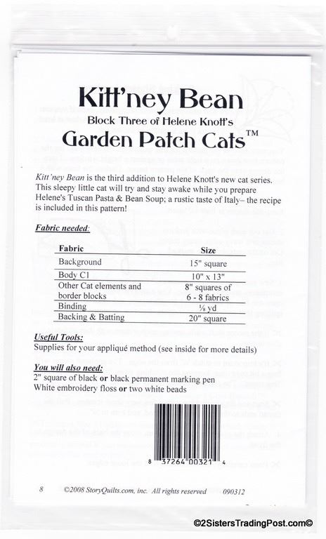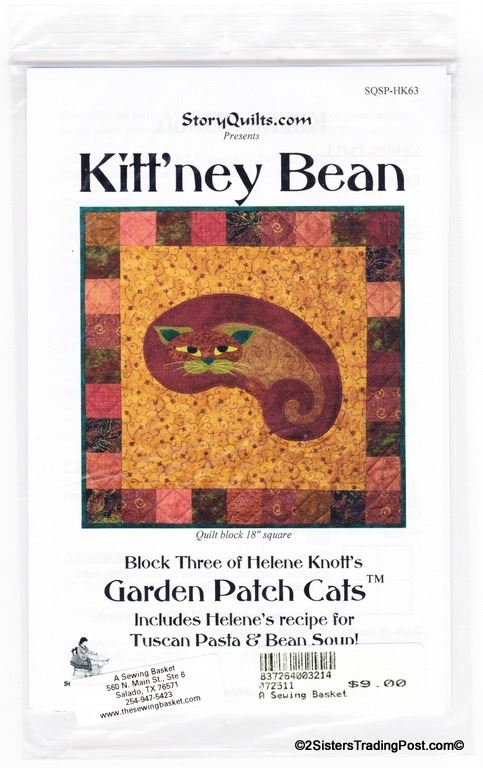 Pattern for 'Kitt'ney Bean' 18" quilt block #3 of Helene Knott's Garden Patch Cats for Story Quilts.com. Each quilt pattern includes a special corresponding recipe 'Tuscan Pasta & Bean Soup'