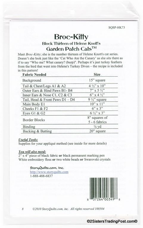 Pattern for 'Broc-Kitty' 18" quilt block #13 of Helene Knott's Garden Patch Cats for Story Quilts.com. Each quilt pattern includes a special corresponding recipe 'Turkey Divan'