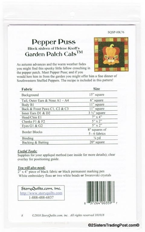 Pattern for 'Pepper Puss' 18" quilt block #16 of Helene Knott's Garden Patch Cats for Story Quilts.com. Each quilt pattern includes a special corresponding recipe Southwestern Stuffed Peppers'