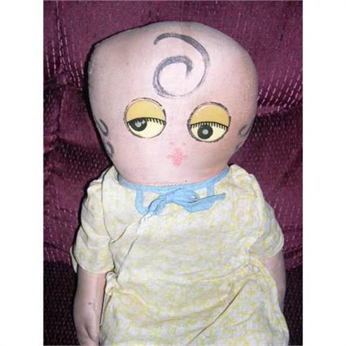 18" Straw Stuffed Cloth Doll Disc Eyes. What a cute face with the moveable eyes. Torso is straw stuffed with a crier that no longer works. The head, arms and legs are tightly stuffed with cotton. She has sol but is still very loveable. Doll comes from a smoke free environment. Buyer to pay $20 for shipping, handling, and insurance. Thanks for viewing.
