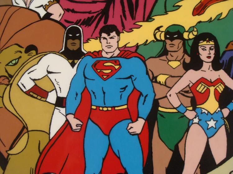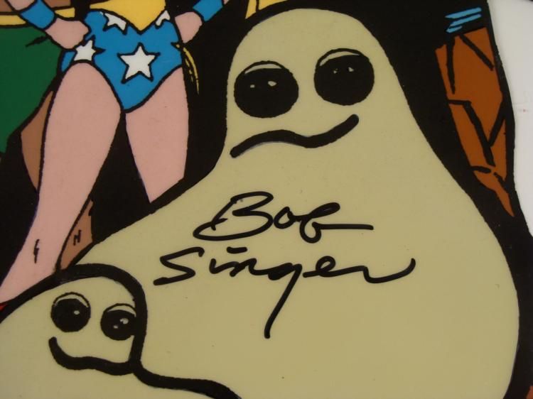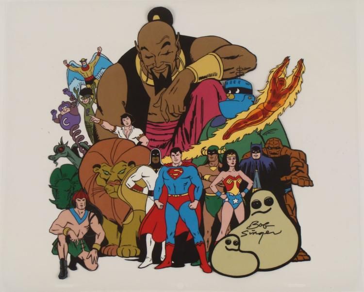 This is an original animation model cel featuring 18 superheroes from Hanna-Barbera cartoons. * They include Superman, Wonder Woman, Batman, the Thing, and more--it's quite a group, all packed into one cel! * Bob Singer's signature appears in black Sharpie at the bottom of the cel. * Bob Singer is an American animation artist, character designer, layout and background artist and storyboard director of animated television programs, most memorably of several Hanna Barbara productions such as The Flintstones, Jonny Quest, Scooby-Doo, Yogi Bear, Droopy, Tom and Jerry, The Jetsons, The Smurfs, Superfriends, and the Harlem Globe Trotters cartoons. * * * Original Animated Cel, hand-painted, with peg holes along the bottom edge Overall Size of the Cel: 10 1/2" x 12 1/2" Excellent Condition -ready to be matted and framedThis is an original cel used in production. Each one-of-a-kind set-up represents a slight change in position of the characters. When individually photographed and projected in rapid succession, the images appear to move. * To create production cels, the original animator's drawing is transferred onto an acetate cel (by hand-inking and/or photo copying). The cel is then hand-painted on the reverse side. * * *