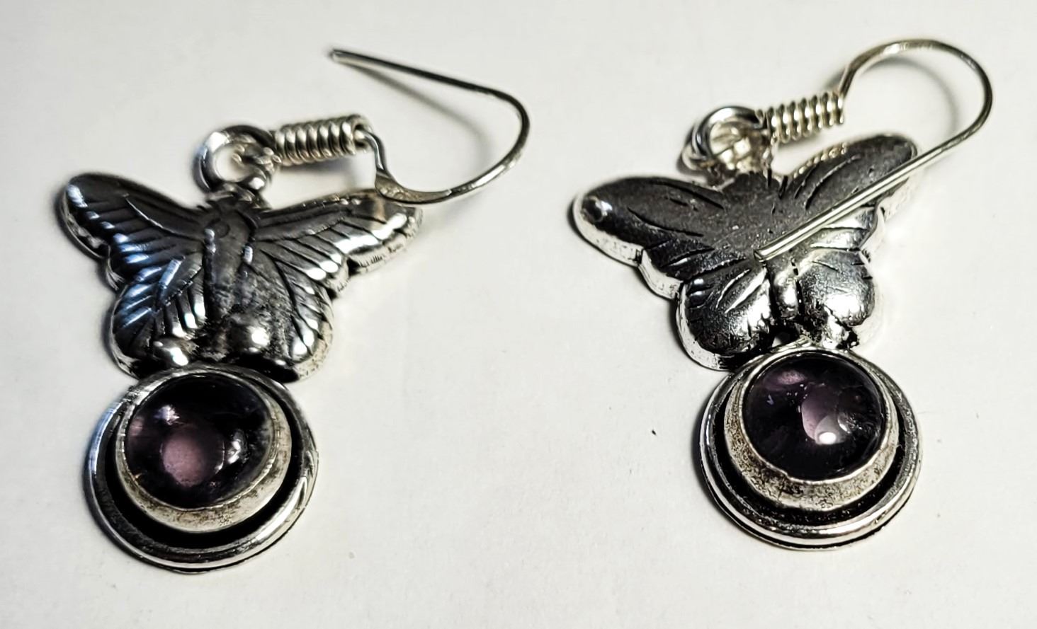 BEZEL SET AMETHYST DROP EARRINGS WITH A BUTTERFLY MOTIF. JEWELLERY