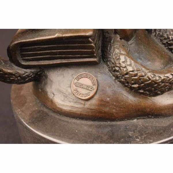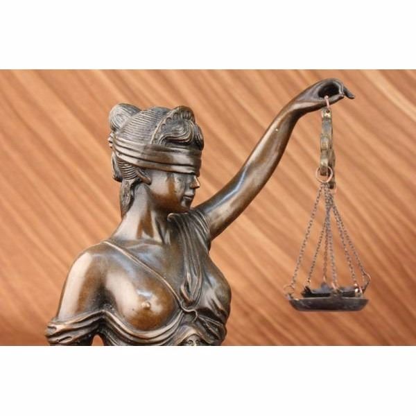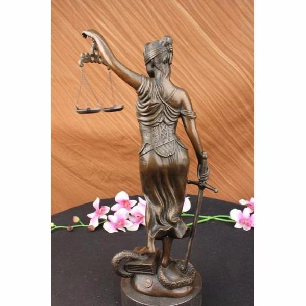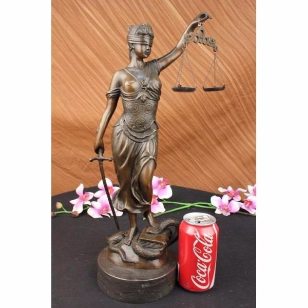 The Bronze Sculpture Is Of Lady Justice (Roman Goddess Of Justice) Who Is The Symbolic Personification Of The Moral Force In Judicial Systems. As Anciently Depicted, The Blindfolded Lady Justice, Is Seen Balancing The Scales Of Truth And Fairness From Her Left Hand, Holding A Sword, While Stepping On A Book And A Snake That Coils Around Her Feet. The Scales, Represent Truth And Fairness And Measures The Strength Of A Case'S Support And Opposition. The Blindfold, Represents Objectivity, In That Justice Is (Or Should Be) Meted Out Objectively Without Biases. The Sword, Symbolizes The Power Of Reason And Justice, Which May Be Wielded Either For Or Against Any Party. The Book Represents History; Signifying To Stand Against Wrongdoings Or With The Good Doings Of The Past. The Snake Symbolizes Hatred Hence The Foot That Stops It From Getting Its Grip. She Was Captured Using The Age-Old Method Of Lost-Wax Casting And Stained With A Brown Patina Finish. She Is Mounted Upon A Black Marble Base. Bronze Dimensions With Marble Base: Height 18 X Width 9 inches. Weight: 12 Lbs.