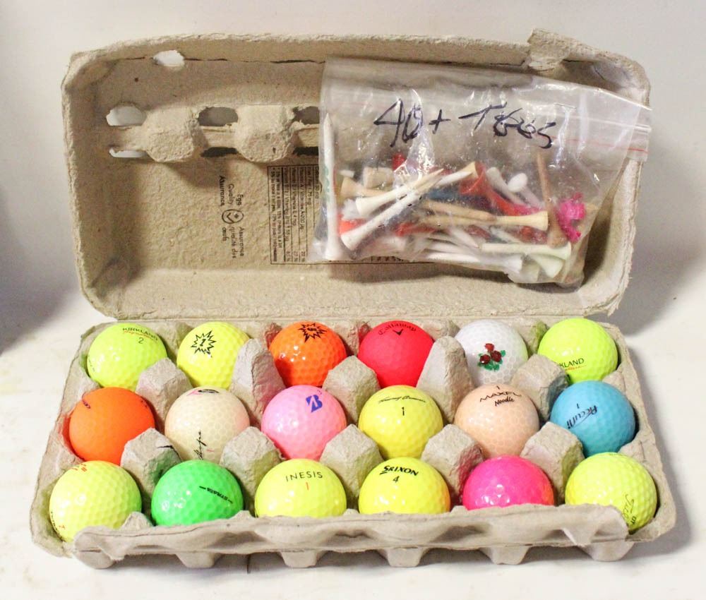 18 USED COLOR GOLF BALLS, 40+ USED TEES MIXED SIZES