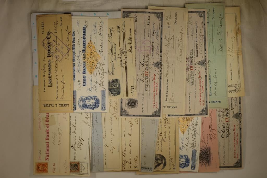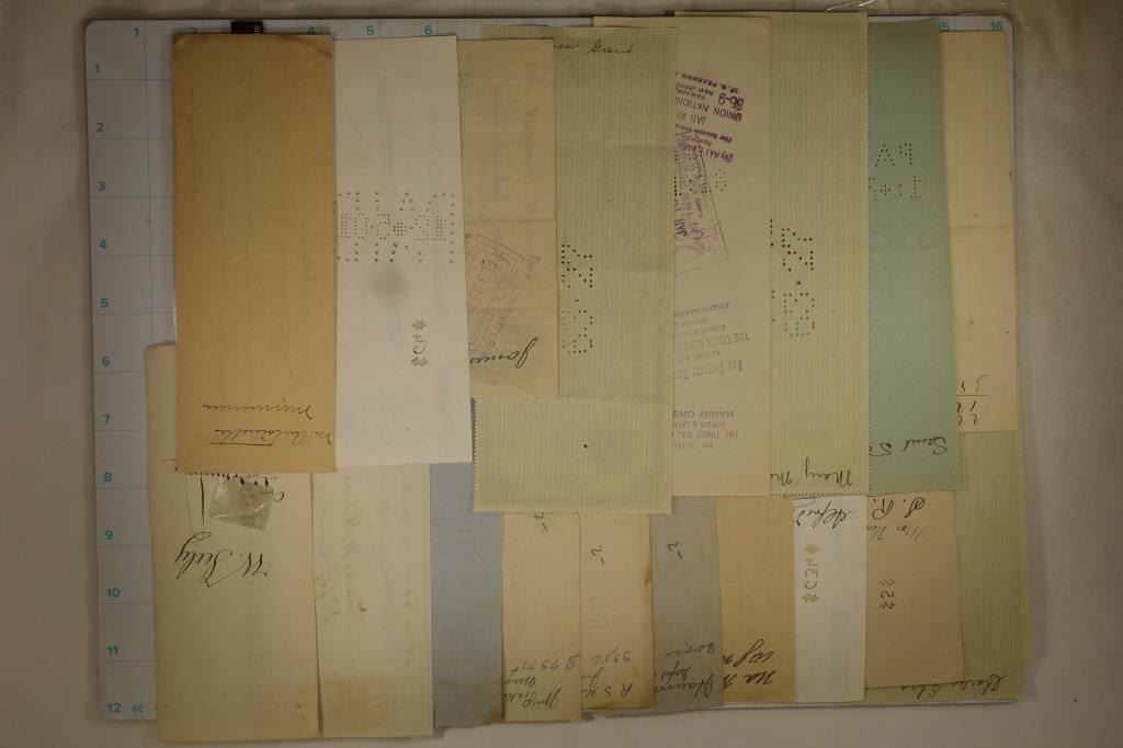 THEM HAVE OLD TWO CENT STAMPS THAT HAVE BEEN CANCELLED. OTHERS HAVE CANCEL HOLES AND VARIOUS MARKS TO INDICATE BEING CASHED ETC. COOL PAPER LOT
