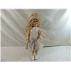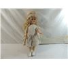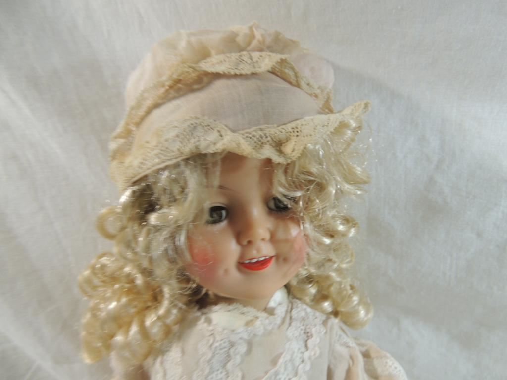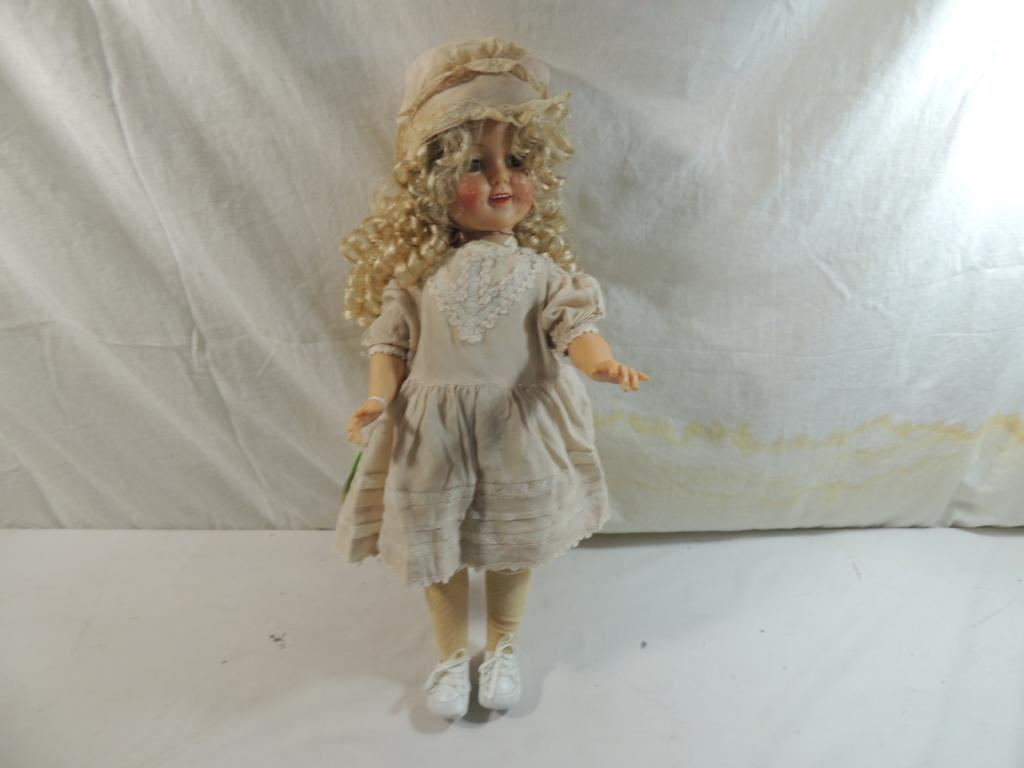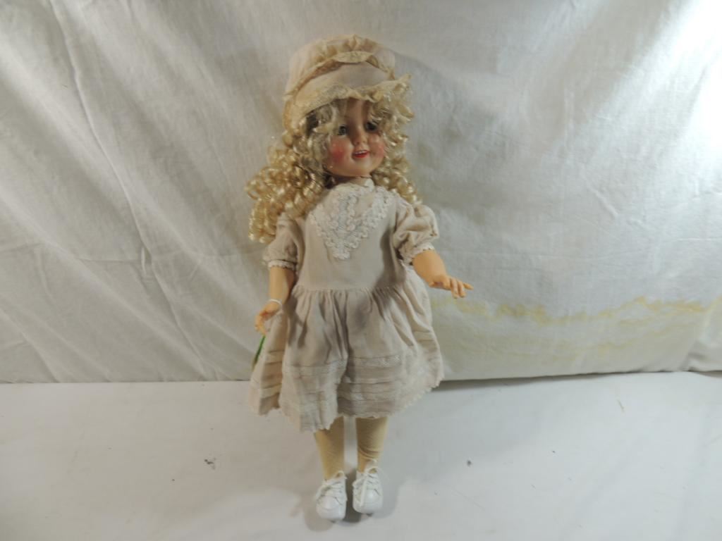 18" VINYL STANDING DOLL. VINTAGE DOLL. ANTIQUE DRESS AND BONNET. AS SHOWN SEE PHOTO FOR MORE DETAILS.