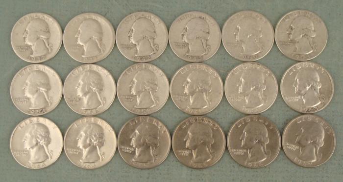 18 Washington Quarters 1937-1967 12 Silver, 15 Diff