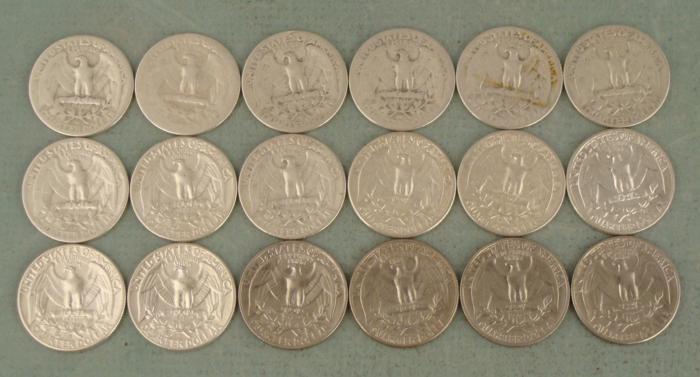 18 Washington Quarters, 15 from different dates and mints, and 12 silver