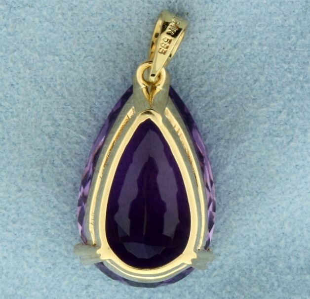 In 14k yellow gold. Contains a 24 x 10.5mm high quality natural Pear shaped Amethyst gemstone with vibrant purple color. Excellent clarity. 1 1/4" long with bale. 6.8g.