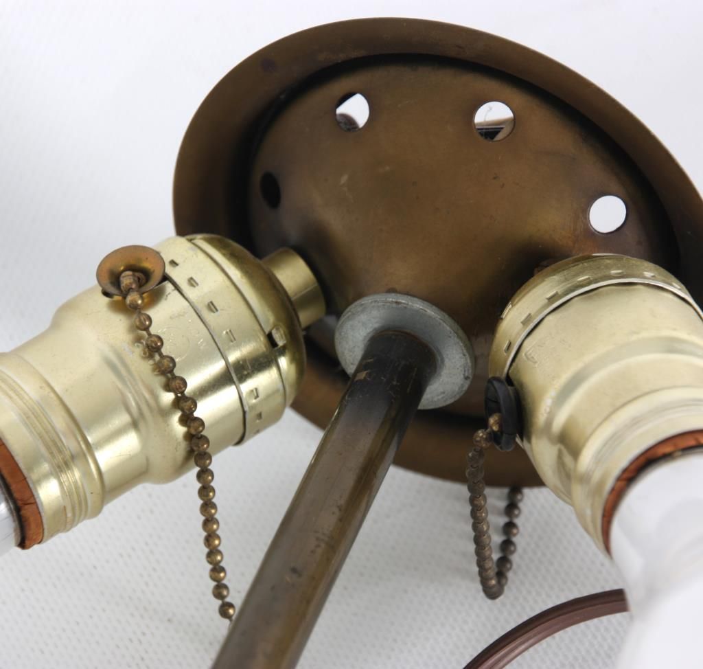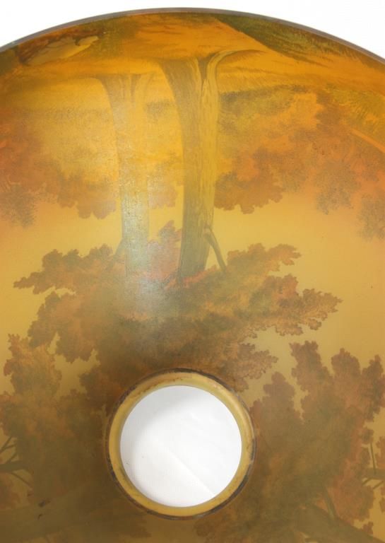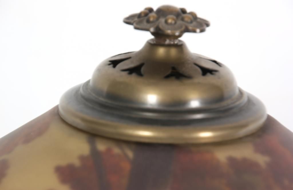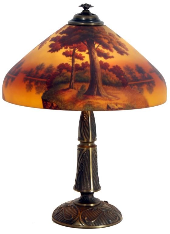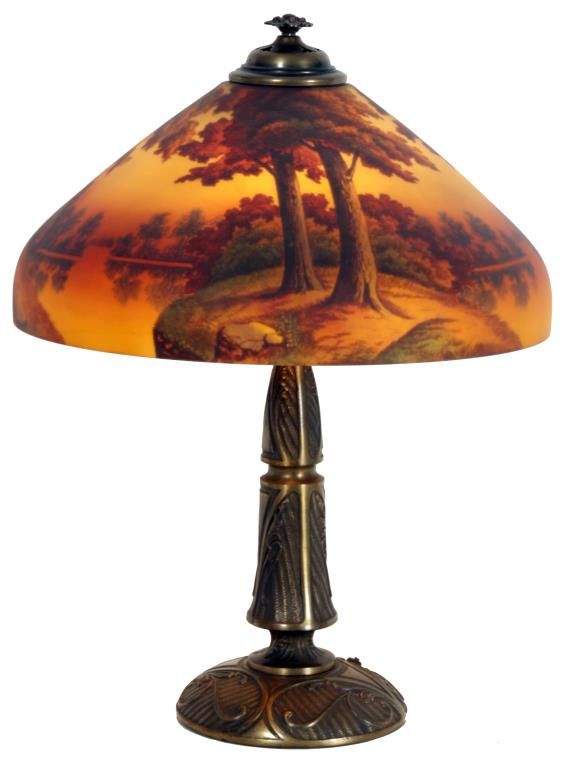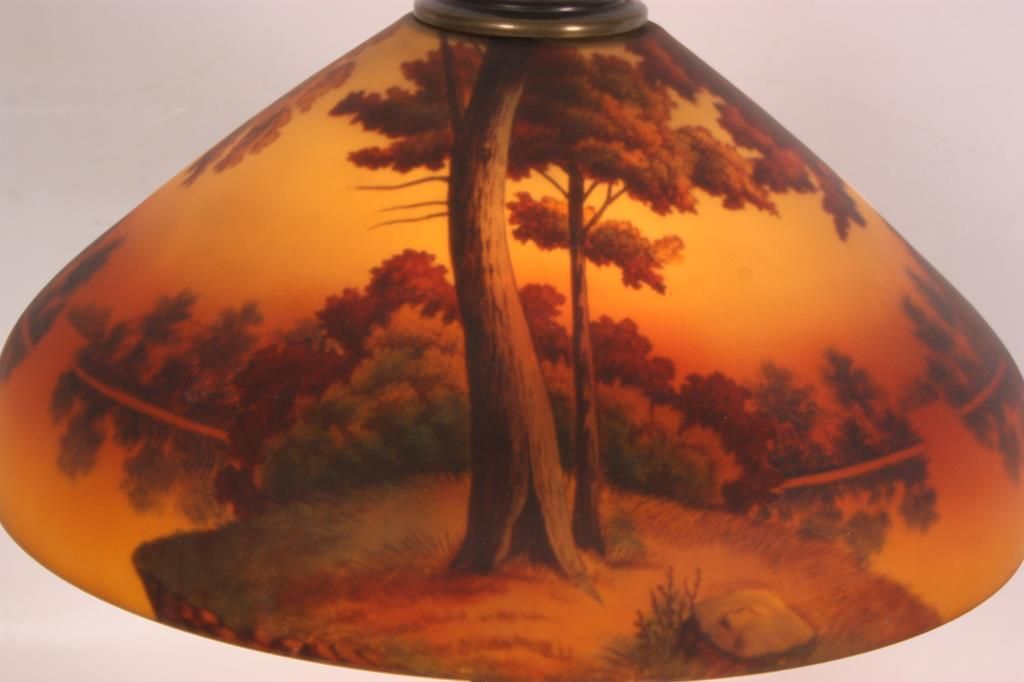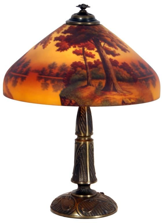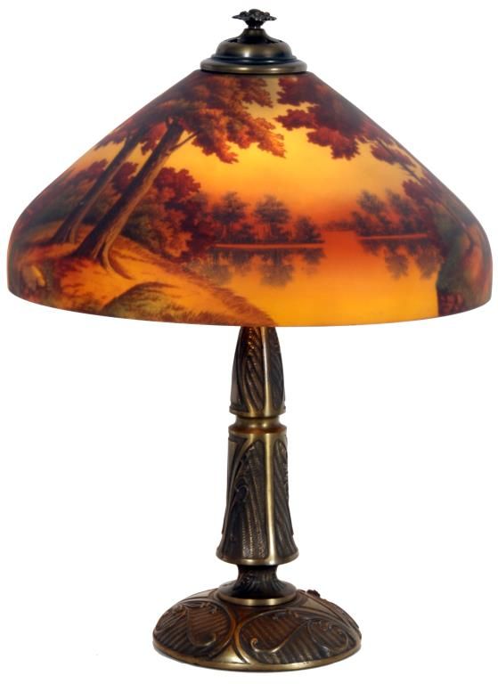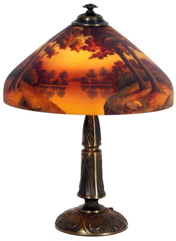 18 in. Phoenix Reverse Painted Table Lamp. Beautiful reverse painted sunset lake scene with large trees along the shoreline in the foreground and colorful early autumn trees lining the shores in the background; on a filigree decorated brass base with typical Phoenix 2 socket light cluster, pierced heat cap and flowering finial. Sockets replaced, shade is in excellent condition with no chips, cracks, repairs or paint loss. 24 in. high.