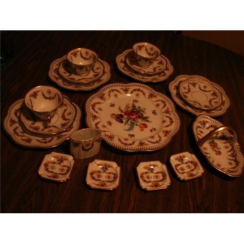 Old Schumann Rheinland luncheon set with serving pieces. Old blue mark dates back to at least c1918. This design is reticulated, pierced, scalloped blank Rheinland Dresden style floral decoration consisting of floral swags with ringed cameos and a different decoration in the center of each plate. Actually this set has two pair. The back stamp on these plates was used from 1918 to 1929 in excellent condition with no chips, cracks or wear to the decoration or gold. They look as though made yesterday. Set includes: 4 luncheon plates, 4 saucers, 3 cups, 11" Serving plate, 8-1/2" basket, 4 ladies ash trays, and 1 oval cigarette holder. Each piece retails over $50 each.
