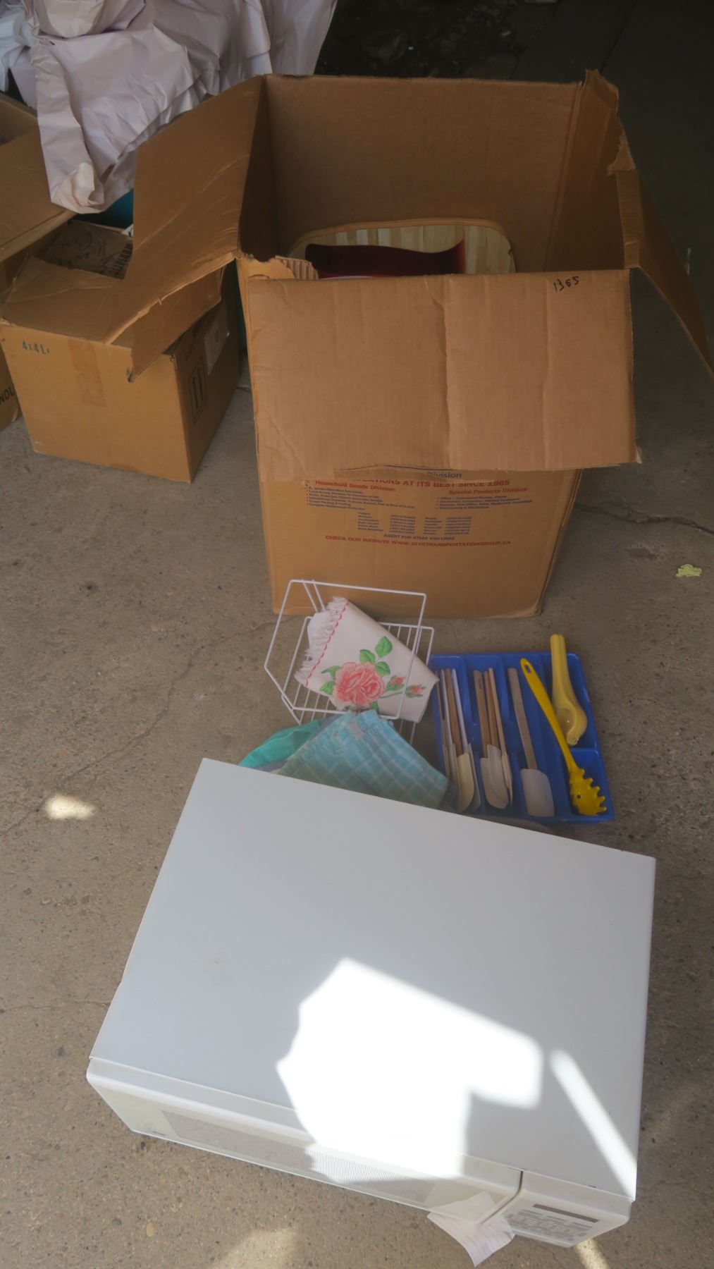 18"x18"x27" Storage unit mystery box of assorted items - kitchenwares and microwave
