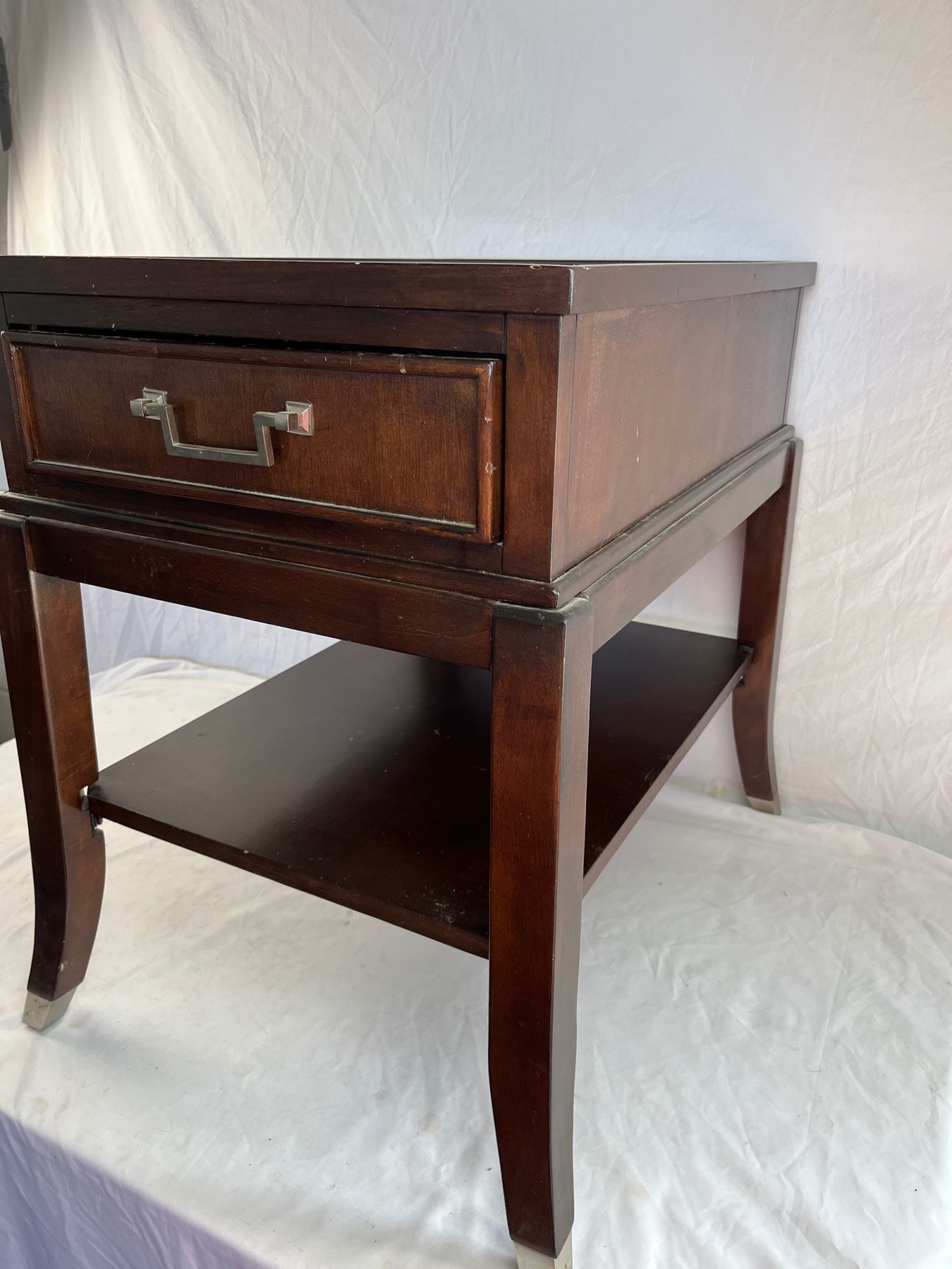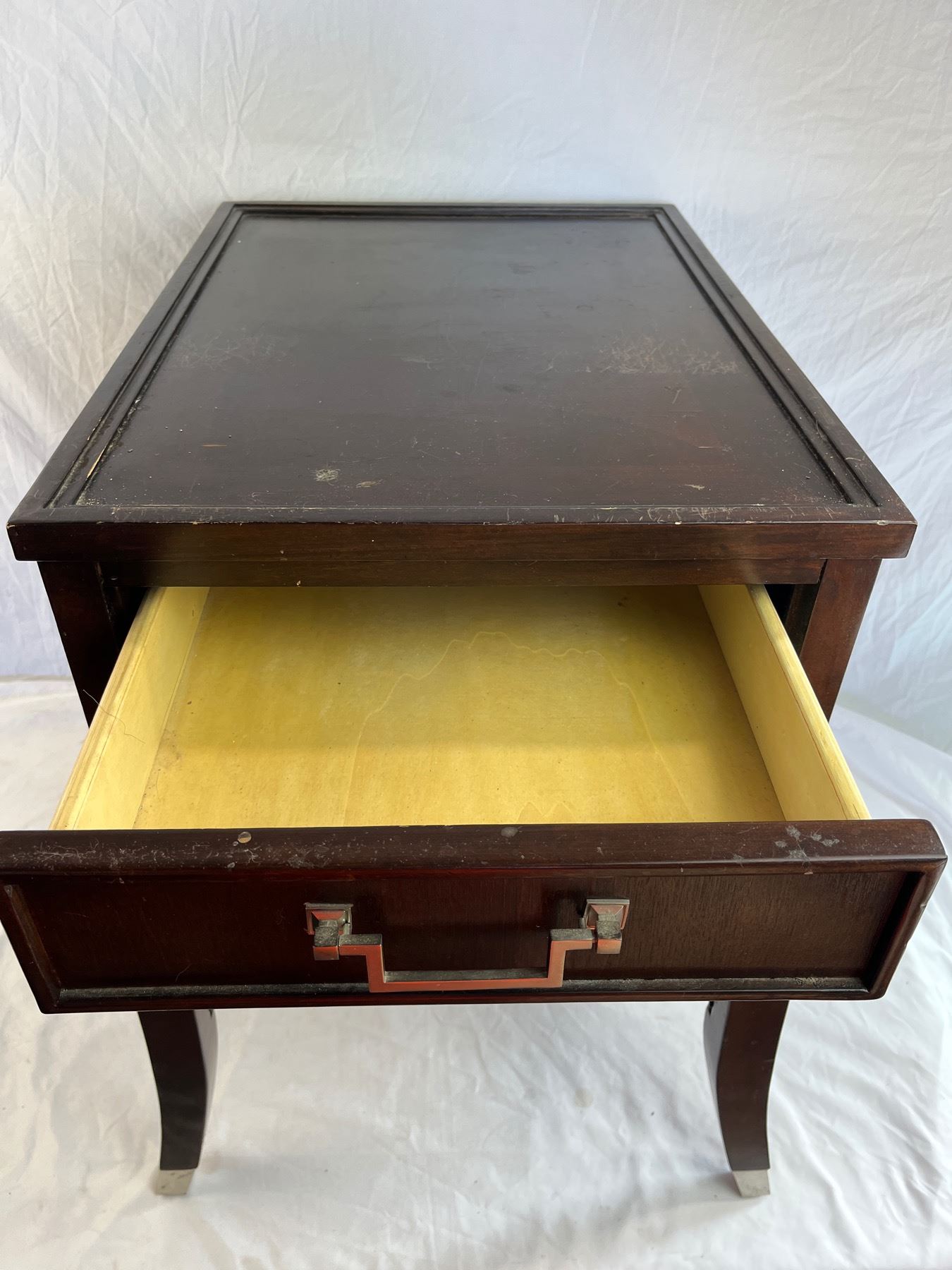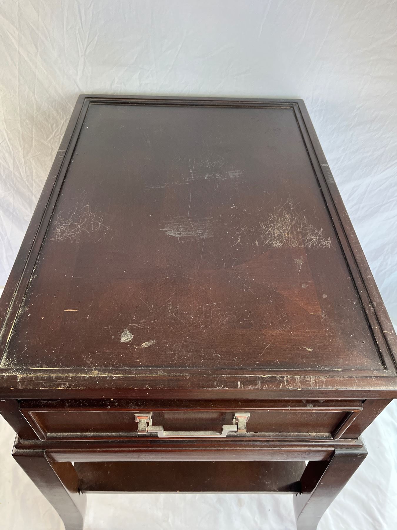 Stands 25" tall with 18"x25" top and front drawyer. Scuffing evident on surface and legs are loose.