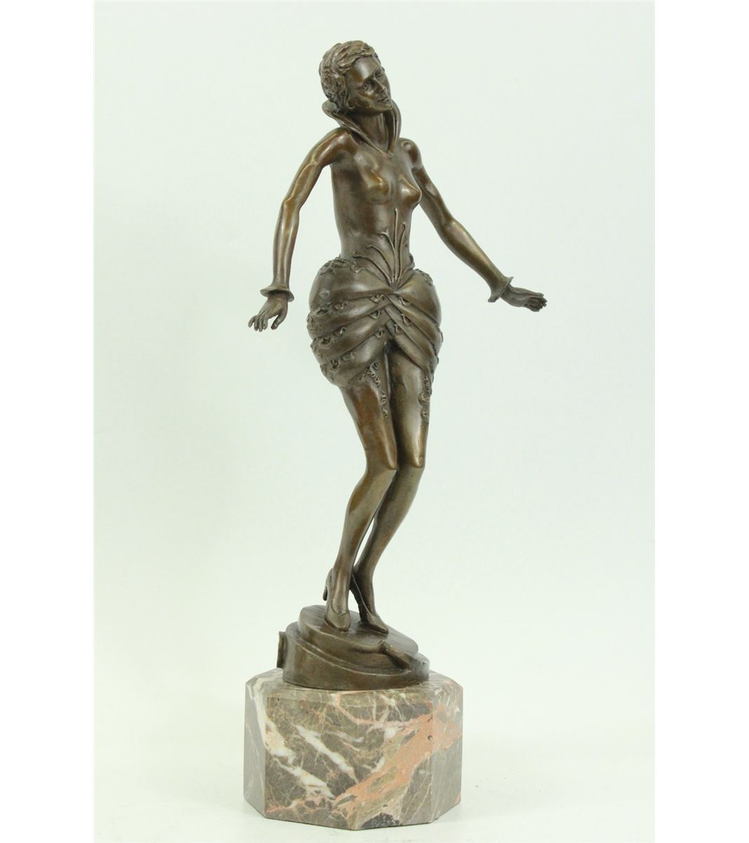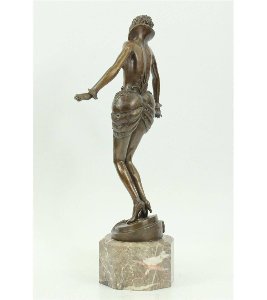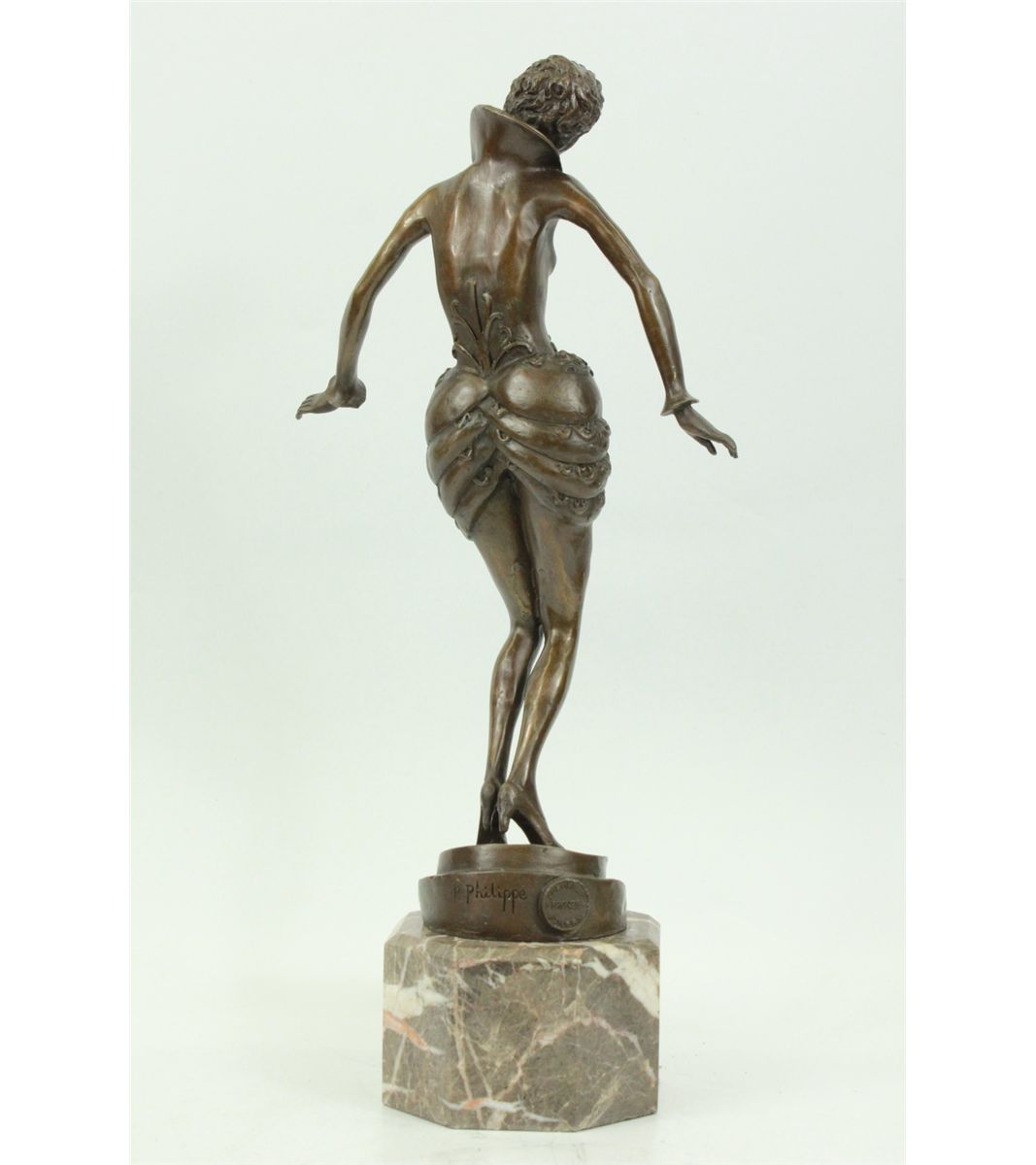 11XN216480 The jovial and exciting performer stands high on her little stage. The woman is dressed in a unique outfit that is embroidered with curves and designs. She has her arms playfully spread . She shrugs her head toying with the audience. She commands attention with her charisma as a performer. This piece stands on a brown marble base. This fun figurine was crafted using the lost wax method. It is signed. P. Philippe...................SHIPPING USA: $20....HI, ALASKA, CANADA: $49...ALL OTHER COUNTRIES: $89