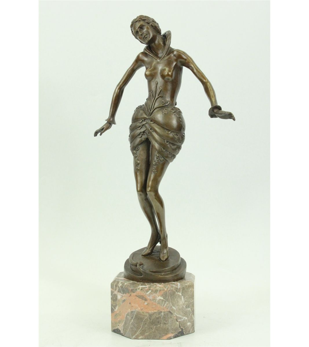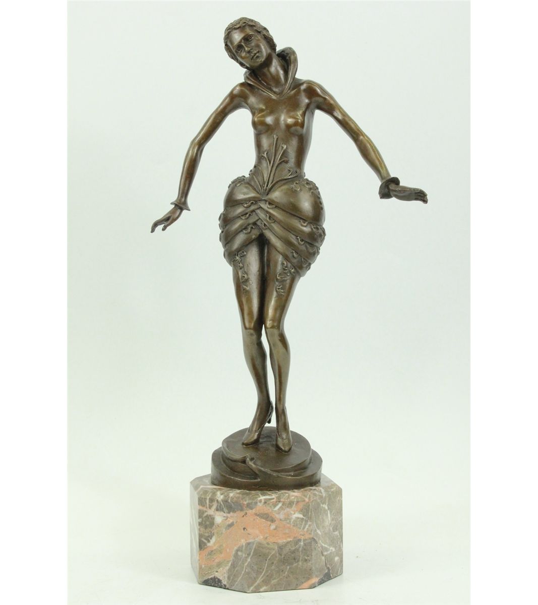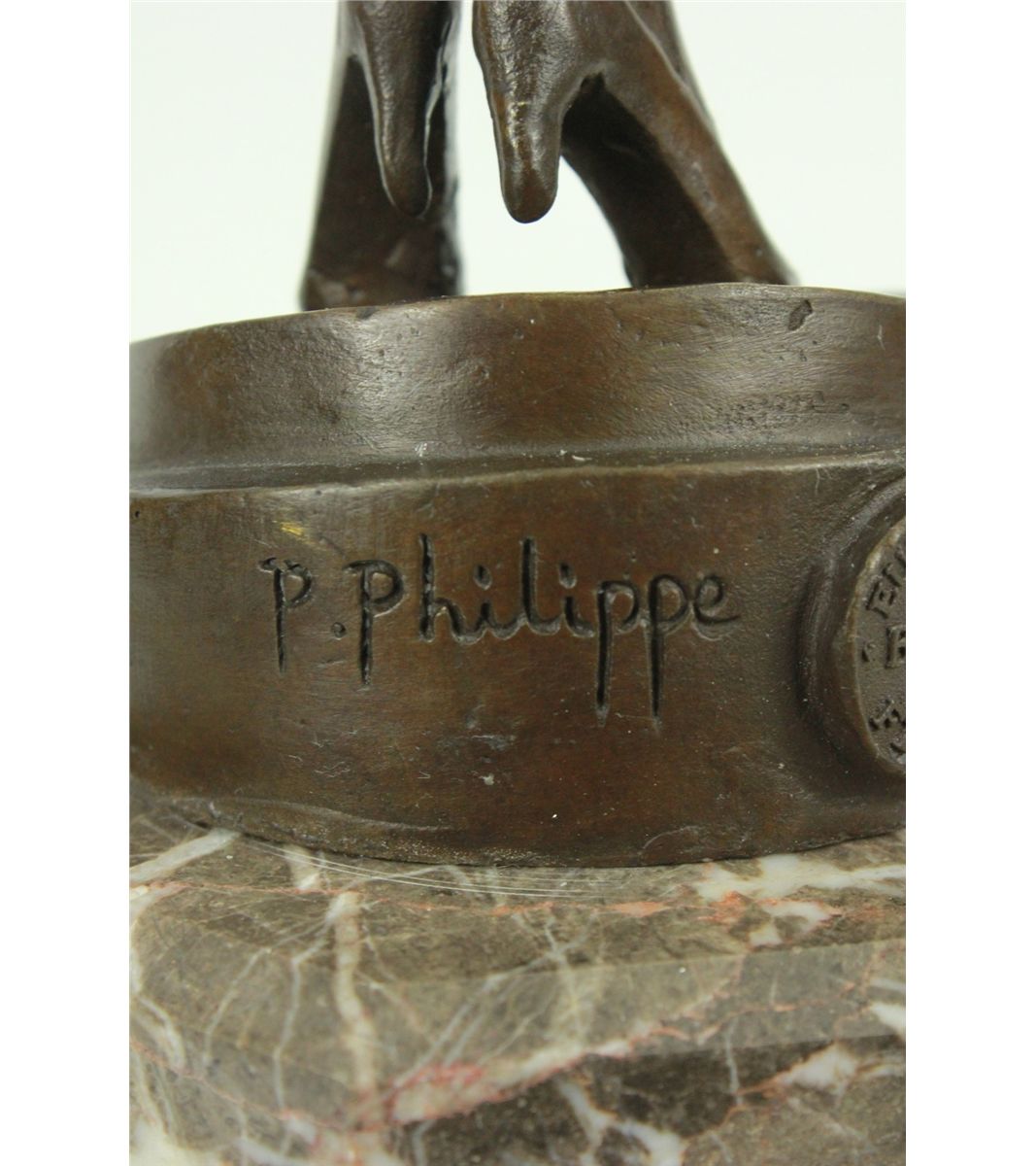 11XN216480 The jovial and exciting performer stands high on her little stage. The woman is dressed in a unique outfit that is embroidered with curves and designs. She has her arms playfully spread . She shrugs her head toying with the audience. She commands attention with her charisma as a performer. This piece stands on a brown marble base. This fun figurine was crafted using the lost wax method. It is signed. P. Philippe...................SHIPPING USA: $20....HI, ALASKA, CANADA: $49...ALL OTHER COUNTRIES: $89